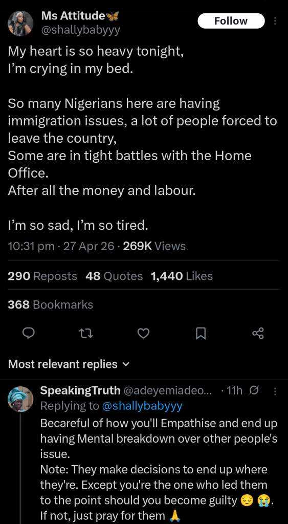 A post circulating on X captured it plainly. Someone wrote about lying in bed, overwhelmed, watching Nigerians around them struggle with immigration issues. People being forced to leave. Others locked in difficult battles with the Home Office after years of work and financial commitment. There was no policy language in it. No analysis. Just exhaustion.